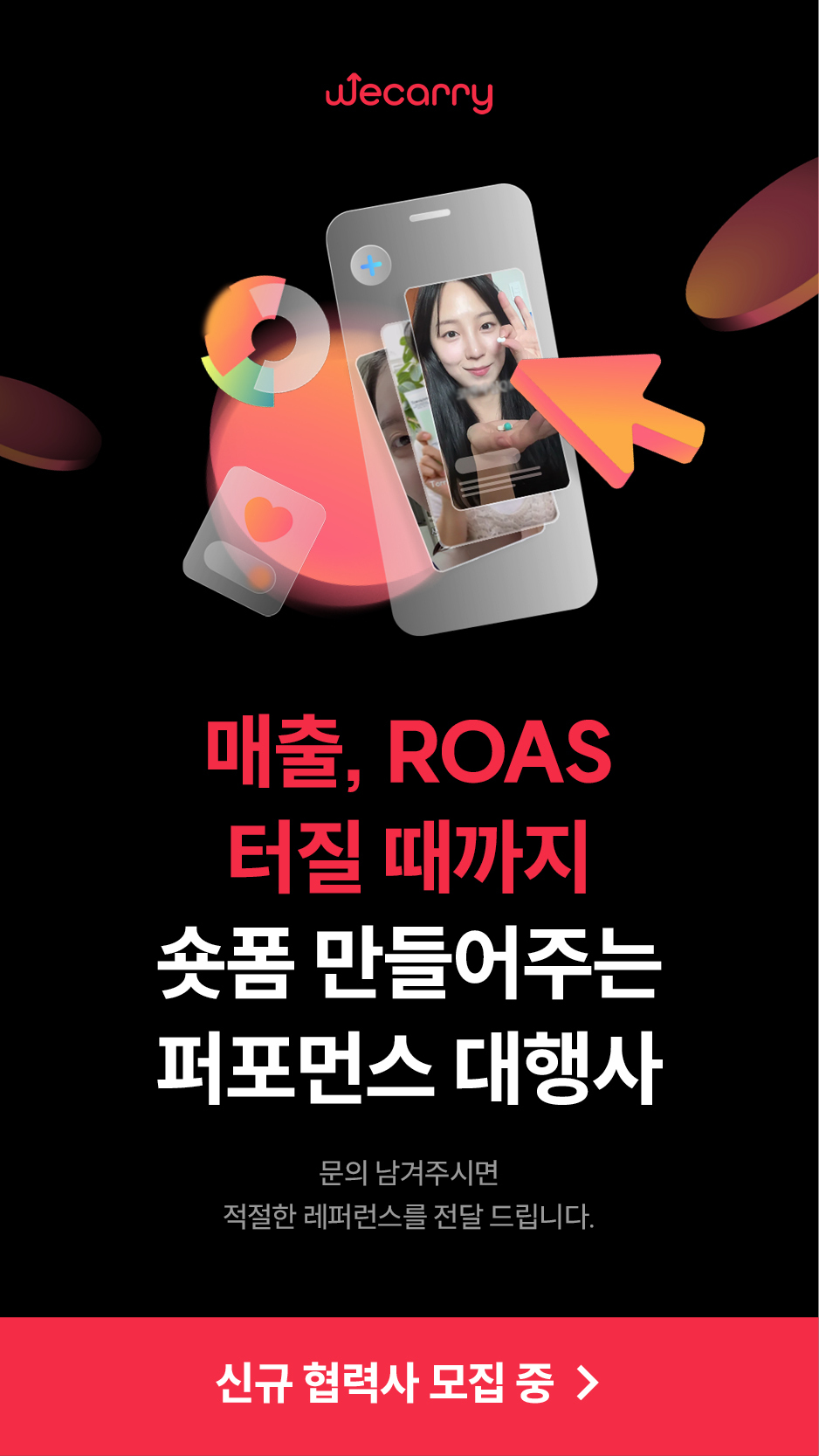 (주)위캐리컴퍼니(we+carry)는 매출 성장과 영업이익의 극대화를 목표로 하는 퍼포먼스 마케팅 에이전시입니다.
